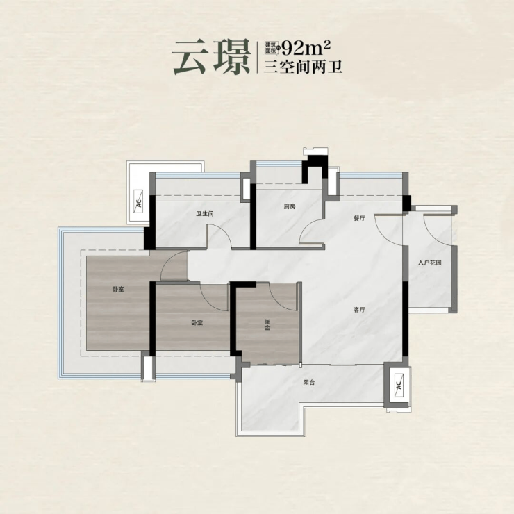 建面约92㎡的“云璟”户型,则以约12米超大采光面惊艳登场。四开间朝南,通风采光极佳;主卧套房设计,私密性与舒适度兼备;中轴式餐厨体系配备高低岛台,可灵活切换中西双厨模式,满足不同烹饪习惯;双面宽L型无柱阳台,更预留创意空间,可改造为书房、花房或儿童游戏区。