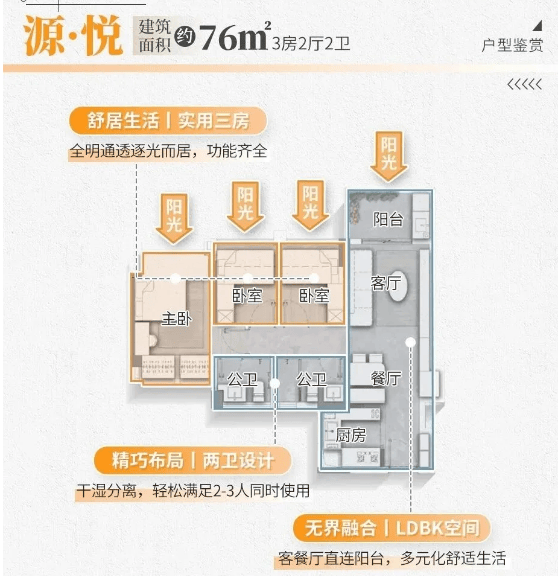这种 “100% 使用率” 带来的实际空间增益,相当于间接降低了 “实际单价”,例如 76㎡户型实际按 90㎡计算,实际单价仅 14400-15600 元 /㎡,性价比优势进一步凸显。