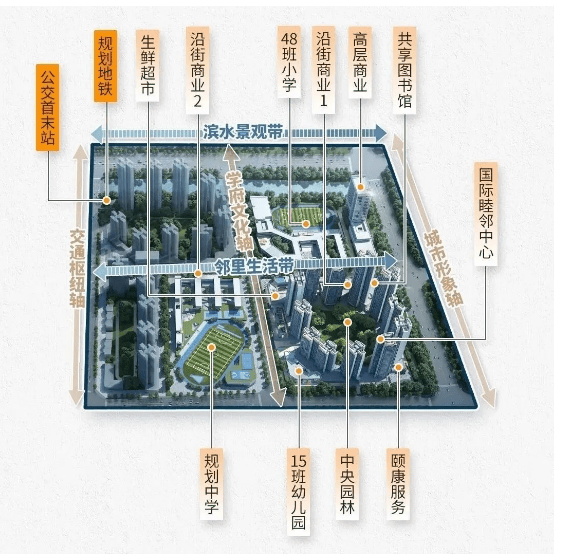 商业配套:自带 2.6 万平方米商业街,规划引入生鲜超市、餐饮、娱乐等业态,未来还将新增约 10 万平方米商办配套,下楼即可满足日常购物需求,无需依赖外部商圈,降低生活通勤成本;