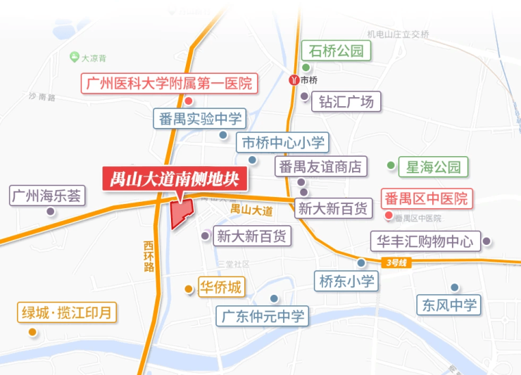 目前,从信达·繁花里步行至市桥地铁站大约需要1.7公里,虽然距离稍远,但可以通过公交或共享单车进行接驳。通过地铁3号线,无需换乘即可直达珠江新城、体育中心等多个CBD和商圈。此外,规划中的26号线或将设禺山大道站,未来有可能升级为地铁上盖项目。自驾出行也十分便捷,周边有禺山大道、西环路等主干道,连接东新高速和新光快速,方便前往荔湾海珠等地。