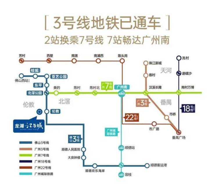 龙湖江与城位于顺德伦教板块,紧邻已开通的佛山地铁3号线伦教站,仅需两站即可换乘广州地铁7号线,九站可达广州南站,轻松融入广佛通勤圈。此外,自驾出行也十分便利,出门即上105国道,一桥直达番禺,无论是前往北滘新城上班,还是到番禺、广州逛街,都显得高效快捷。这样的交通优势大大降低了在北滘、番禺等地工作的购房者的通勤成本。
