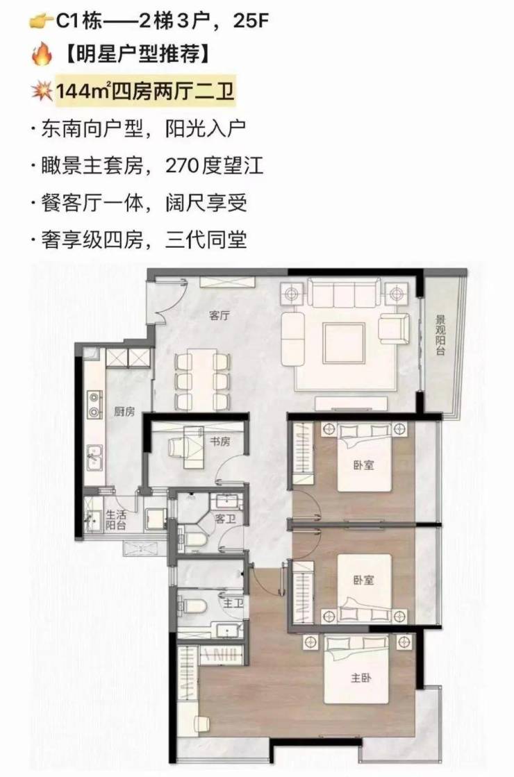 港汇台户型设计建面69至144平方米,涵盖二至四房,兼顾居住舒适性与空间美学。每户均配置双阳台,东南向朝向可观江景,LDK一体化设计动静分区明确,主卧与客厅空间宽敞通透。C1栋主推144㎡及127㎡户型,主卧朝南;C2栋户型包括东向124㎡及113㎡、南向96㎡及北向69㎡户型,可满足不同家庭结构和购房需求。科学的户型布局使每个空间利用率高,功能分区合理,实现美学与实用的平衡。