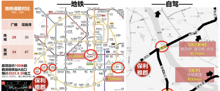 保利·雅郡紧邻鹤洞地铁站,距离地铁C出口仅约200米,未来地铁A出口预计在2025年9月完工。项目周边交通网络发达,广佛线、未来11号线及多条公交线路交汇,使得通勤效率极高。1站可达沙涌站换乘11号线,2站可达昌岗换乘8号线,实现快速通往珠江新城、琶洲及其他核心商圈。自驾出行亦便捷,毗邻鹤洞路、芳村大道、珠江隧道及洲头咀隧道,轻松抵达海珠西、越秀及老西关区域。
