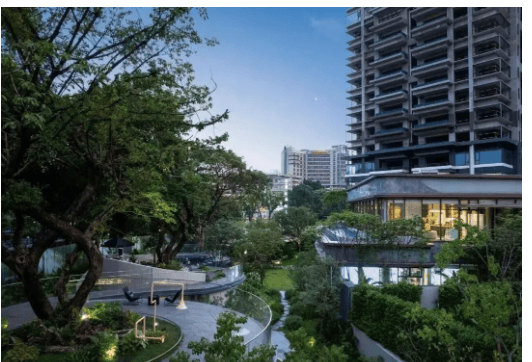 项目内部配套极为丰富,打造了9000㎡内外双花园,原址保留2棵原生古榕树,打造约2000㎡的月牙形榕树公园前厅,营造出自然静谧的居住氛围,业主茶余饭后可在花园内散步、休闲、聊天,感受自然与生活的融合。同时,项目采用“城市浮岛”设计,将整个小区抬高7-9米,算上约5.3米的架空层,小区的2楼约等于普通小区的4-5楼,有效隔绝外界街区噪音和粉尘,提升居住的静谧性和舒适度,同时也能获得更好的采光和视野。