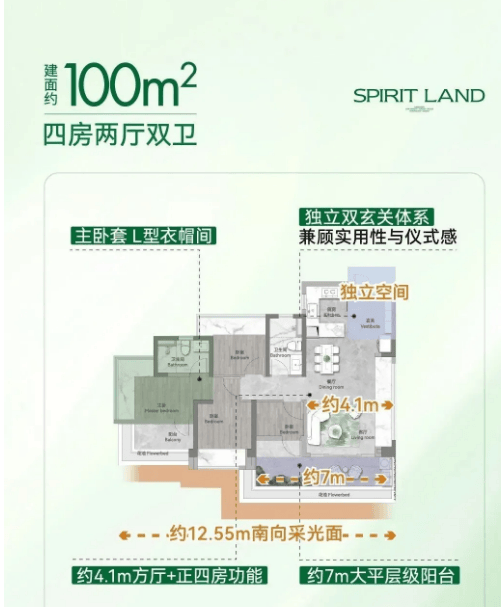 特色设计方面,客厅采用LDKG+X一体化设计,打造约4.1m方正巨厅,空间开阔,连接约7.2m大平层级阳台,阳台宽度远超同面积段户型,可用于休闲、观景、晾晒等多种用途,兼具实用性与观赏性;主卧为独立主卧套,配备独立卫生间和衣帽间,空间宽敞,私密性强,让业主享受舒适、便捷的居住体验;四个房间布局合理,动静分离,休息区与活动区互不干扰,既能满足家人日常休息的需求,也能预留出书房、儿童房、老人房等,适配不同家庭的居住需求;卧室配备270°转角飘窗,全景广角视野,可将小区花园景观尽收眼底,提升居住的舒适度和体验感。