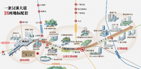 万科・檐屿城位于番禺区,距离 2 号线、7 号线的广州南站约 1.5 公里,小区设有公交车和楼吧接驳地铁站,出行较为便利。22 号线(后通段)预计 2025 年开通,届时 5 站可达白鹅潭 CBD。此外,广佛环线东环 2025 年开通,3 站可到琶洲;东晓南路 - 广州南站连接线南段 2025 年与海珠湾隧道同时通车,15 分钟可实现南站与海珠城区互通,30 分钟连通珠江新城 CBD。以广州南站为中枢,项目构建起 “15 轨立体枢纽”,实现 4 站万博、4 站海珠芯、6 站珠城,湾区 1 小时通勤。