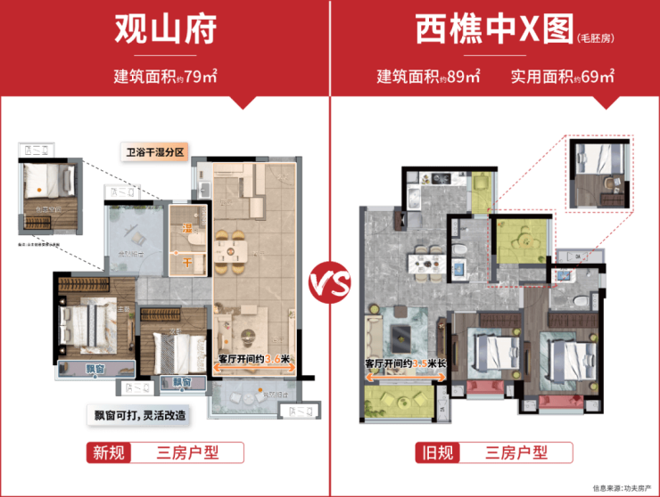 在南海在售项目中,建面约 80㎡以下户型多为两房,空间局促。而观山府大胆创新,打造出建面约 79㎡的新规三房户型。客餐厅一体化结合约 3.6 米客厅开间,空间感远超同板块某些建面约 90㎡的旧规户型。U 型厨房与客厅的布局,让家庭聚会充满欢乐。以两房预算购得高使用率三房,节省资金可精心布置家居,提升生活幸福感。