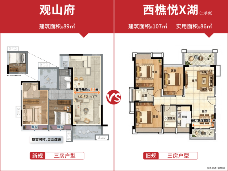 建面约 89㎡的新规三房成为项目热销榜首户型。客餐厨一体化设计,搭配约 3.5 米客厅开间与南向瞰景阳台,空间开阔通透,阳光与清风自由穿梭。套房式主卧配备独立卫浴,提升生活便捷性与私密性。全屋飘窗可灵活拆改(除洗手间外),能打造观景坐榻、阅读角等,增添生活意趣,且功能性媲美西樵悦 X 湖建面约 107㎡户型,实现 “小投入,大享受”。