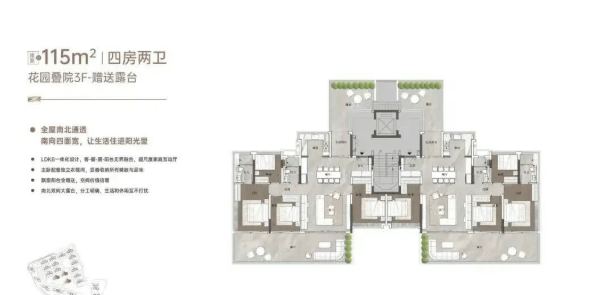 “玥境”叠院系列(112-130㎡):以类别墅形态呈现,赠送率惊人。首层户型赠送双花园,使用率高达262%;二层送80㎡花园,使用率达235%;三层享南北双露台,南向露台超30㎡;四层为顶复设计,赠送天台,使用率约242%。LDKG一体化布局、南向四面宽设计,兼顾功能与尺度。