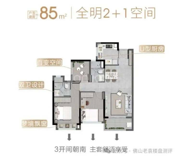 亮点:仅85㎡却做到了三房两卫,且全部南向,这在市场上极为罕见。总价约165万起,完美解决了年轻家庭的首置痛点,让上车桂城不再是梦想。