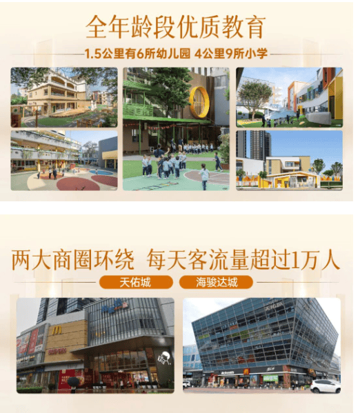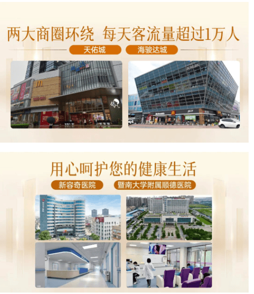 项目坐拥成熟完善的15分钟黄金生活圈,商业、教育、医疗、休闲、文化配套全方位落地,无配套等待周期,日常居家烟火气息浓郁,全家庭生活需求一站式满足。商业配套双重商圈加持,紧邻天佑城、海骏达城两大核心商业体,商圈日均客流稳定,购物、餐饮、娱乐、休闲业态齐全,下楼即可享受主城繁华商业体验。教育配套层级完善、密度极高,片区教育资源富集,一点五公里范围内覆盖六所幼儿园,四公里内汇集九所小学、五所中学,包含海尾幼儿园、细滘小学、海尾小学、容桂外国语学校、省一级桂洲高级中学、容桂实验学校等全龄段优质教育资源,构筑家门口的一站式精英教育体系。医疗配套坚实可靠,周边坐落暨南大学附属顺德医院、新容奇医院两大优质医疗机构,为全家人身心健康保驾护航。休闲文化配套丰富多元,3A级渔人码头、海尾公园、花溪公园、文塔公园等生态休闲场地环绕,搭配容桂文化艺术中心、图书馆、体育中心等公建配套,兼顾日常康养休闲与文化娱乐生活,繁华与宜居双向兼顾。