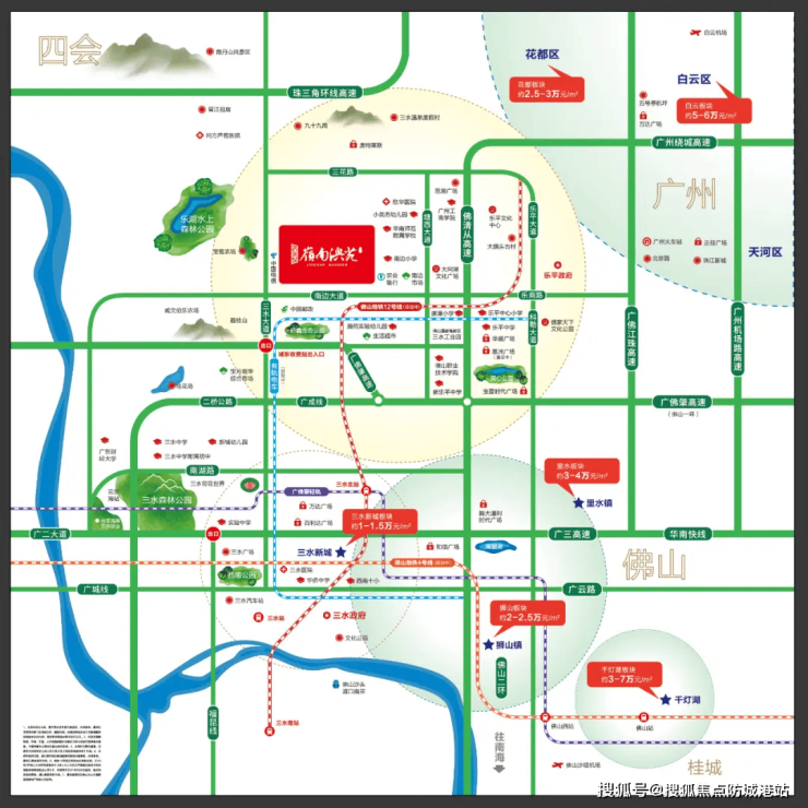 路网交通:项目周边“三横三纵”主干道(如广三高速、三水大道、南丰大道等)形成立体交通网,驾车约20分钟可达三水万达广场,约30分钟直达佛山新城CBD,通勤效率远超同区域竞品。