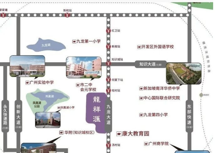 地理位置无疑是康大龙祥汇的一大卖点。距离14号线旺村站约900米,汤村站约700米,步行时间大约7-10分钟,属于真正的地铁盘。此外,即将建设的广州市活力创新轴快速路(北段),将大大缩短从知识城到天河金融城的时间至15分钟。虽然目前公共交通仍在完善中,但自驾出行非常便利,项目距离广河高速入口约2公里,前往珠三角其他城市也十分便捷。