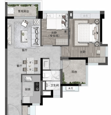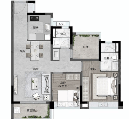 建面约115㎡三房两厅两卫+百变空间:横厅设计,客厅面宽达6.2米,景观阳台约5.5米面宽,得房率约98%。