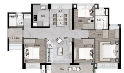 建面约105㎡三房两厅两卫+百变空间:横厅布局,客厅面宽约6米,主卧面宽约4米,得房率约98%。