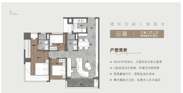 建面约88平方米:三房两厅两卫,紧凑实用;