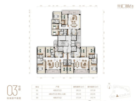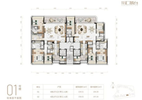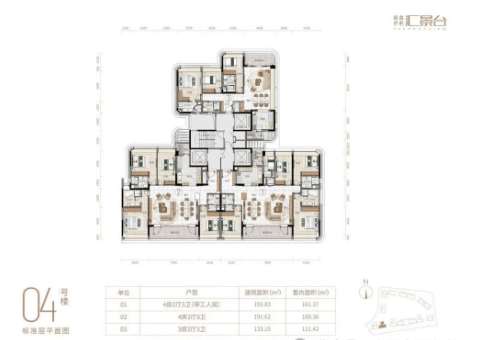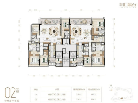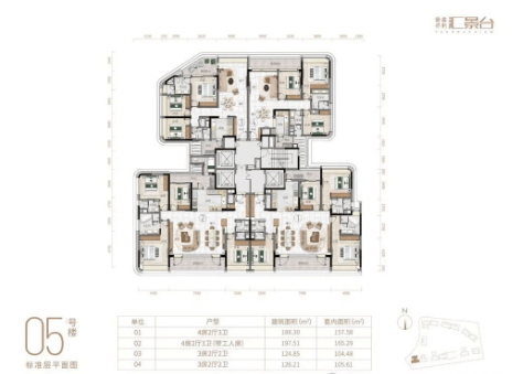 汇景台的产品涵盖了123-352平方米的三至五房户型,共八种不同类型的户型可供选择,实用率约为82%-84%。在外立面设计上,项目采用了陶板外墙与铝板幕墙相结合的方式,既美观又具有节能环保的特点。室内空间则通过弧形元素的应用,增强了流动感和细节美感,体现了对生活品质的极致追求。