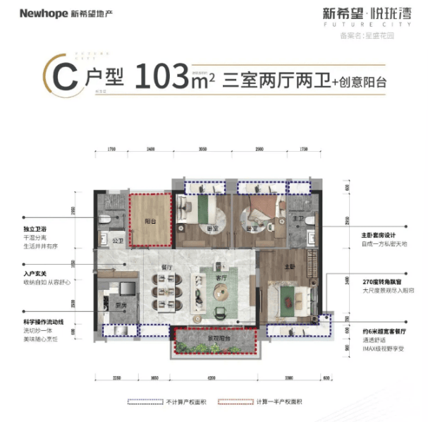 C户型:103㎡四房两厅两卫,满足三代同堂需求,户型方正无缺角,赠送面积多,居住舒适度高。