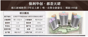 保利华创·都荟天珺位于广州市天河区,具体位置在华南快速和黄埔大道交汇处,紧邻珠江新城东区。该项目由保利集团开发,占地11,000平方米,总建筑面积达38,000平方米,容积率为3.4,绿化率为35%。小区共规划有3栋高层住宅,层高20-26层,总计提供166套大平层户型,面向高端改善型买家。