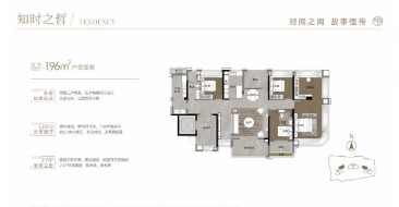 196平米户型:双主套设计,客厅、卧室、阳台等开间尺度更大,适合追求宽敞空间的家庭。