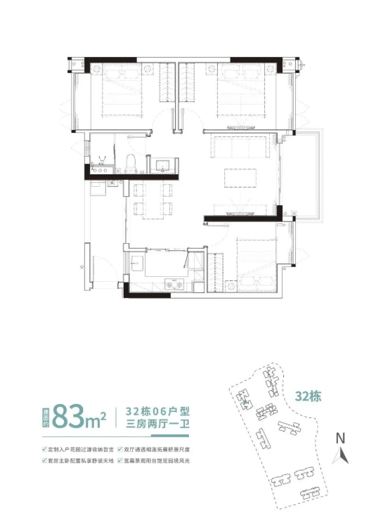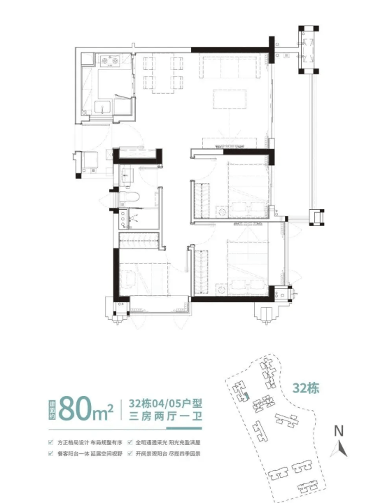 当前主推的观灏组团32栋悦景楼座,主打建面约86㎡、96㎡、100㎡三房户型,均为南北通透、多面采光设计,部分单位更可实现三面望水,将珠江水景与园林绿意尽收眼底。户型布局科学,空间利用率高,在有限面积内最大化居住舒适度,充分契合现代家庭对“小而美、精而全”居住理念的追求。