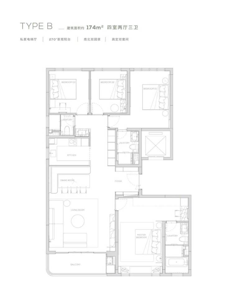 174㎡的四房户型适合二胎家庭或三代同堂居住,核心亮点在于270度环幕观景阳台,坐在阳台就能将林海或湖景尽收眼底,每天都能享受自然与诗意的生活。户型采用南北通透设计,配备全景落地窗,室内采光通风效果拉满。