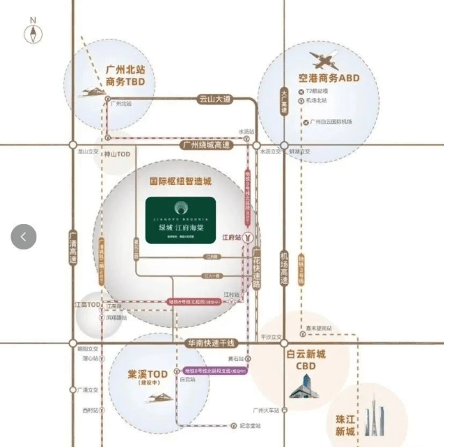 交通方面,项目距离8号北延线和北延支线交汇处的江府站约800米,通过地铁网络可快速通达白云新城及越秀天河等地。广花快速路双向8-10车道全程无红绿灯,15分钟可达白云核心,30分钟直达珠江新城。此外,广清高速水沥出口距项目仅5分钟车程,方便快捷地接驳广州各区。