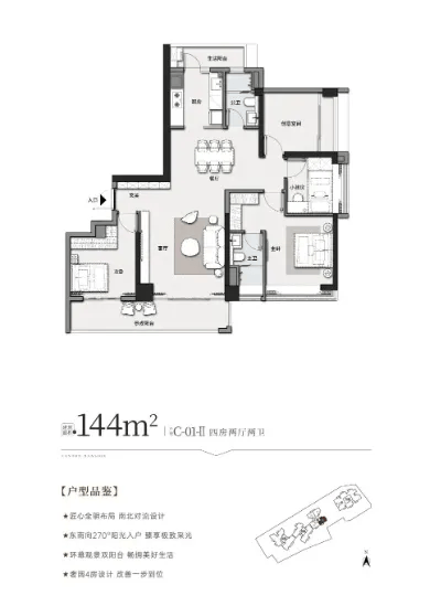 144㎡四房两厅两卫为项目最大户型,总价700-720万元。横厅设计连接南北双阳台,主卧配备步入式衣帽间与独立卫浴,高楼层部分单位可远眺城市景观,彰显尊贵生活格调。