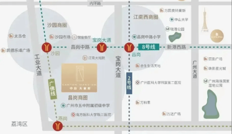交通,是衡量一个楼盘价值的核心指标。中旅天宸府在这方面堪称“教科书级别”。项目距离地铁8号线宝岗大道站仅约200米,步行2-3分钟即可进站。8号线作为贯穿广州东西的黄金动脉,向西6站直达荔湾陈家祠,向东7站约20分钟抵达珠江新城CBD,中间经停琶洲南、琶洲、客村等核心商务区,完美覆盖广州主流就业中心。