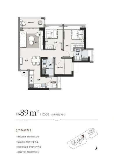 89㎡三房两厅两卫为近期加推热门户型,总价420-440万元。三梯四户设计,主卧带独立卫浴与飘窗,L型厨房动线合理,餐客厅一体化提升空间感,实用性与舒适度兼备。