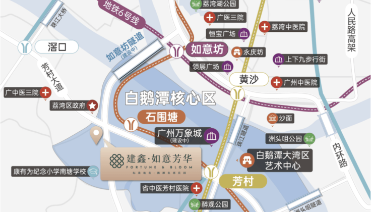 项目地处白鹅潭核心区与西关交汇处,享受荔湾区府板块全维交通优势。距离11号线石围塘站约600米,换乘方便,可直达珠江新城、金融城及琶洲板块。自驾方面,通过芳村大道、洲头咀隧道及内环路可快速通达天河、越秀等核心区域,未来如意坊二期高架建成后,通行效率将进一步提升。项目距离珠江大桥约1公里、珠江隧道约2公里、洲头咀隧道约3公里,主城四区可快速互联,出行便利性高。项目所在板块具备天然的“铁商文政教医”全维配套优势,周边交通网络完善,实现静谧居住与繁华城市之间的高效衔接,为购房者提供便利的通勤和生活环境。