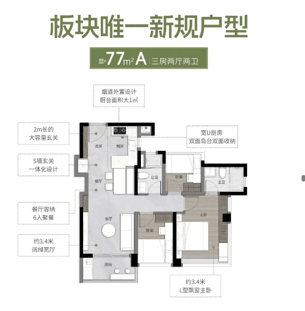 主推建面约 77㎡、88㎡、103㎡、105㎡、135㎡三到四房,作为南站万博首个新规产品,实用率超 120%,最高约 138%。以 77㎡A 户型为例,三房两厅两卫,三面宽南向,270° 全景舱主卧,客厅采用 LDK 公区方案,空间开阔。88㎡B 户型,南向三房两厅两卫,主卧 270° 飘窗并配备创意功能,客厅开间 3.9 米,中西厨分离,7.3 米通铺阳台,LDKG 一体化设计让空间互动性更强。各户型设计精巧,部分阳台开间超过 7 米,满足不同家庭的生活需求。此外,全屋隐藏式中央空调交付,还配备方太厨房三件套、智能马桶等超配交标,99 项精选定制板材,120 处魔鬼精工细节,提升居家质感与美观度。