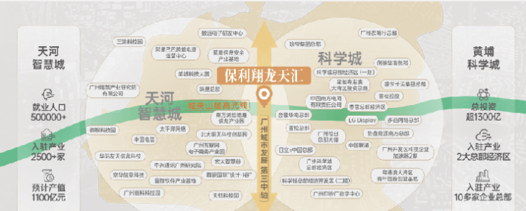 所处的黄陂板块是天河智慧城与黄埔科学城的双城交汇之地,天河智慧城作为广州 “最强大脑”,以 4 倍珠江新城的投资力度打造,定位 “广州硅谷”,已吸引 2500 家企业进驻,包括网易总部、酷狗等科创龙头,2025 年将建成全市创新型企业孵化培育高地。广州科学城则是广深科技创新走廊重要 “创新极”,万亿级产业集群效应显著,规模以上战略性新兴产业产值占全市 50% 以上,高技术产业产值占全市 72.6%,科技创新能力稳居全国经开区第一。