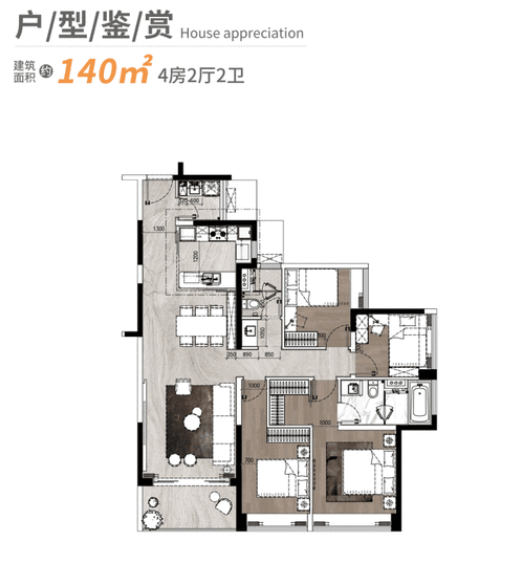 140㎡的户型则主要分布在B栋、C栋和E栋,部分楼栋为2梯3户,居住舒适度更高。这款户型最大的亮点在于其横厅设计,客厅面宽可达7.7米,搭配270°环幕景观阳台,视野极为开阔。站在阳台上,可以俯瞰整个小区的园林景观,远眺金融城的天际线。动静分区明确,公共活动区和休息区互不干扰,适合对空间尺度有一定要求的家庭。宽敞的客厅可以容纳多人聚会,也可以作为家庭影院或阅读角使用。