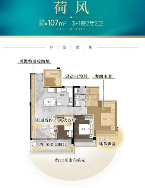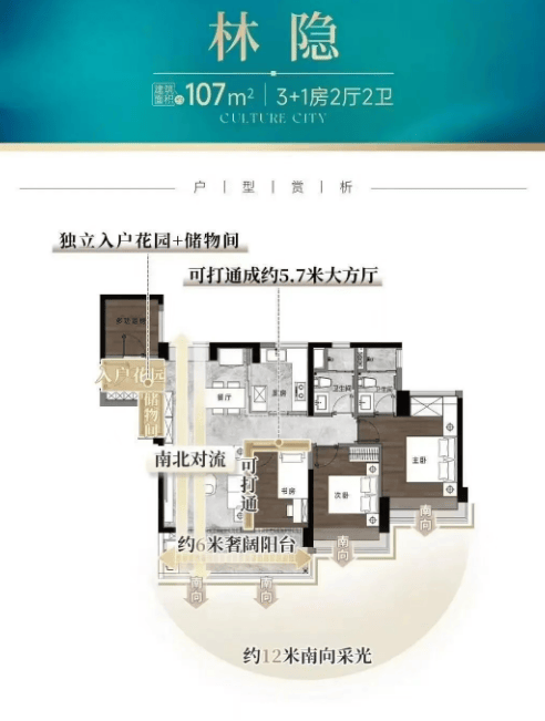 建面约107㎡四房两卫:紧凑实用的小户型设计,适合刚需家庭。拥有12米南向采光面,通透LDK一体化设计,配备独立入户花园。