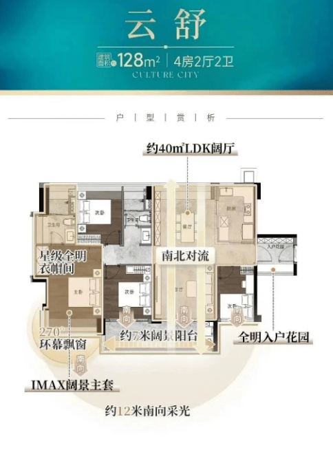 建面约128㎡四房两卫:经典竖厅布局,南北对流,配备约40㎡阔厅,碾压市场同面积产品。