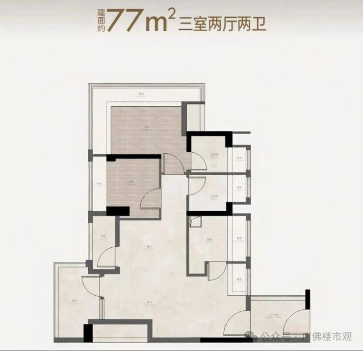 建面约77㎡三房两卫(刚需首选,紧凑实用不拥挤)