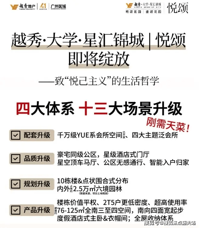 越秀大学星汇城是广州区的高端改善型住宅项目,由国企华发集团打造,主打 “城央垂直生活圈 + 三文园学区”,是广州地标级奢宅。以下是项目最新介绍:房价、折扣、户型图、特价房源、优惠活动、开盘时间、交房时间、周边配套、最新详情等咨询