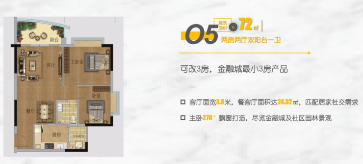 🅣🅞🅟03户型【85㎡2房1卫】南向园林景观