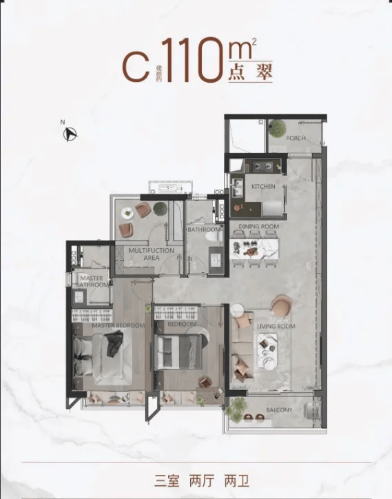 110㎡三房两厅两卫:总价约420-440万元。提供双阳台或入户花园两种版本,L型厨房动线流畅,动静分区合理,主卧带大飘窗,视野开阔。