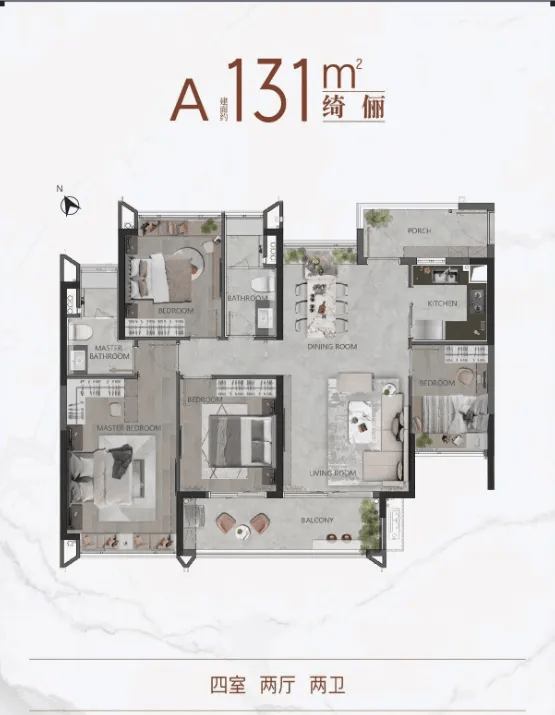 131㎡四房两厅两卫:总价约500-520万元。南北对流设计,通风极佳;部分单位北向阳台直面湿地公园,景观价值突出;四房布局满足多代同堂或二胎家庭需求。
