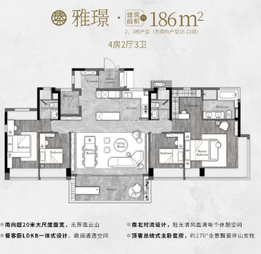 186平方米的四房户型,是万科瑧山府的巅峰之作,专为那些对生活品质有着极致追求的塔尖人群打造。这个面积段的户型,已经超越了普通的居住功能,上升到了艺术享受和精神追求的层面。