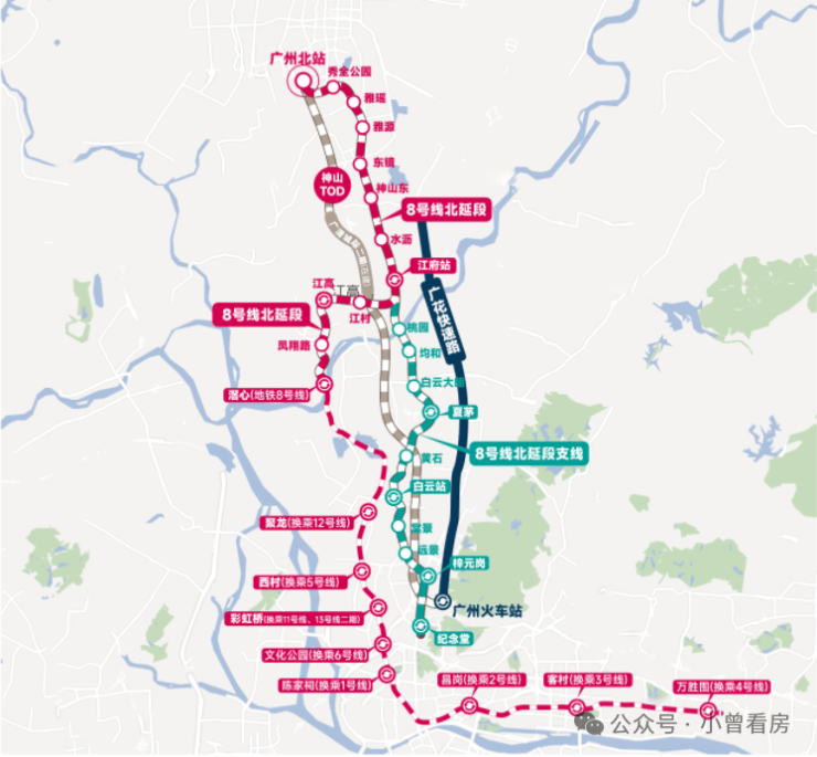 项目门前规划有地铁8号线北延线及8号线北延线支线的换乘站——汇江府站。根据广州市发展和改革委员会于2025年底批复的《广州市城市轨道交通第三期建设规划调整》,该线路已进入详勘和动工阶段,预计于2027-2028年建成通车。