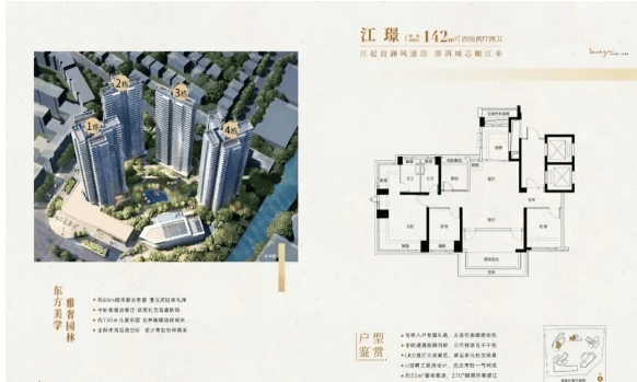 142㎡四房两卫:2梯2户专梯专户,全屋南向,主卧270°转角飘窗,江景视野最佳,得房率优势最明显。