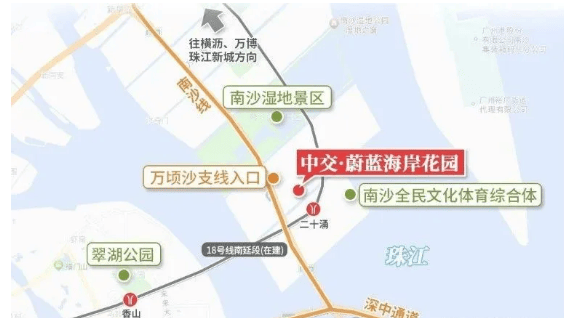 中交・蔚蓝海岸位于广州城市南拓发展轴与黄金内湾的战略交汇点。项目距离已通车的深中通道南沙线收费站约 1 公里 ,驱车半小时就能抵达深圳前海。距离在建的 18 号线南延线(南中城际)二十涌站仅约 500 米,线路设计时速高达 160 公里 / 小时 ,未来将形成大湾区交通枢纽,半小时内畅达广州、深圳、中山、珠海。周边虽目前商业、医疗配套处于发展阶段,但规划有高中 1 所、九年一贯制学校 1 所,附近还有私立名校广州南外实验学校。商业方面,周边规划有约 14.3 万㎡商业用地,未来将打造综合性商业中心。
