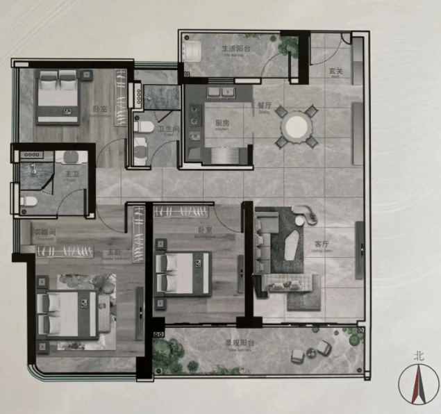 建面233㎡四房两厅三卫:采用了双主卧套间布局,非常适合二胎家庭或与老人同住的家庭。两个主卧都配备了独立卫生间,有效避免了早晚高峰期的使用冲突,保障了各自的隐私。客餐厅开阔大气,衔接超大景观阳台,既能兼顾日常居住,又能满足社交宴请的需求。