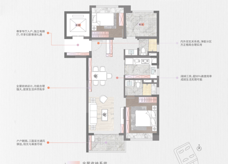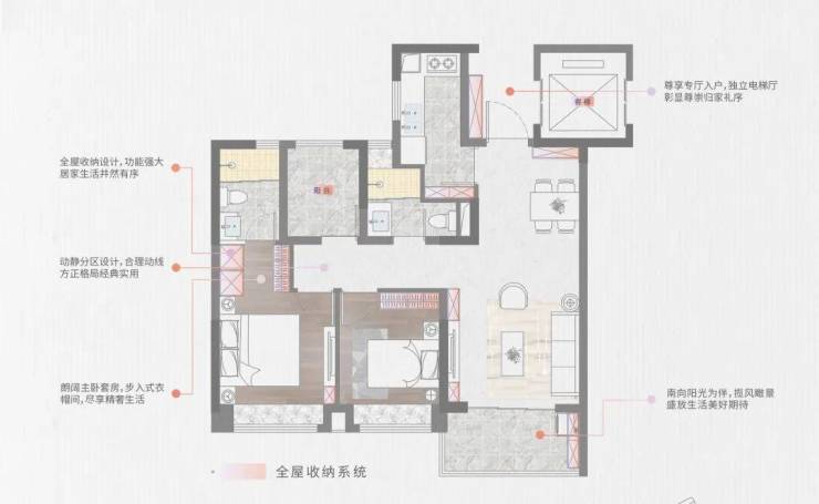 每个户型均配备专梯入厅设计,即使是建面约89㎡的2+1房也有独立电梯前室。这一设计不仅提高了私密度和安全性,还增加了收纳空间,满足现代家庭对储物的需求。