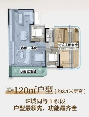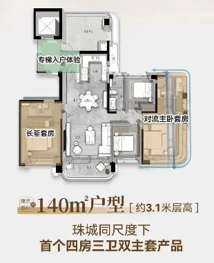建面约 140㎡四房:经典改善户型,客厅开间 4.2 米,南北双阳台,主卧套间设计,配备步入式衣帽间与独立卫生间,满足家庭成长需求。