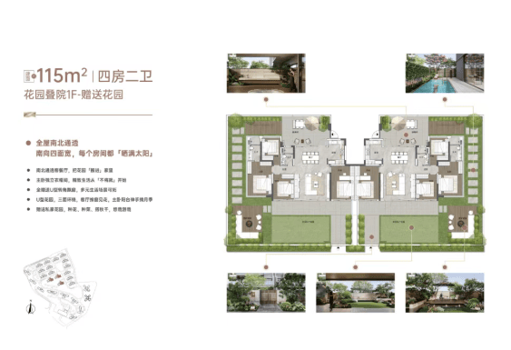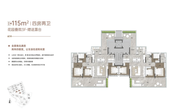 首层约115㎡户型,是全盘赠送率最高的户型。首层双花园赠送高达170㎡,使用率做到了惊人的262%。内部采用了LDKG一体化设计,南向四面宽,让阳光和风景毫无保留地涌入室内。住在这里,仿佛拥有了一座私家花园,种花种草、品茶读书,尽享田园之乐。