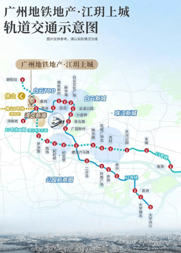 更为值得期待的是,地铁13号线二期(朝阳-天河公园段)有望在2026年正式通车。这条线路串联了白云、荔湾、越秀、天河四大核心区,被誉为“财富列车”。江玥上城紧邻13号线二期凰岗站,且站点与社区实现了无缝衔接。未来,业主从家门口出发,2站抵白云站,10站达珠江新城,约15分钟即可到达荔湾彩虹桥站,约30分钟直达珠江新城。这种高效的通达能力,让江玥上城成为了真正意义上的“全城枢纽”。